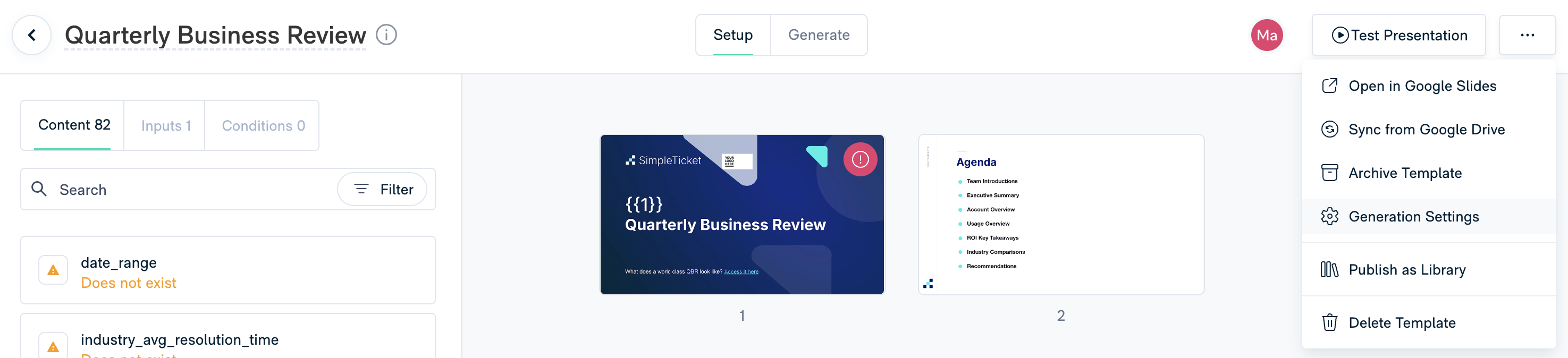 Navigate to the template and click on the ellipsis menu in the top right. Select Generation Settings.
