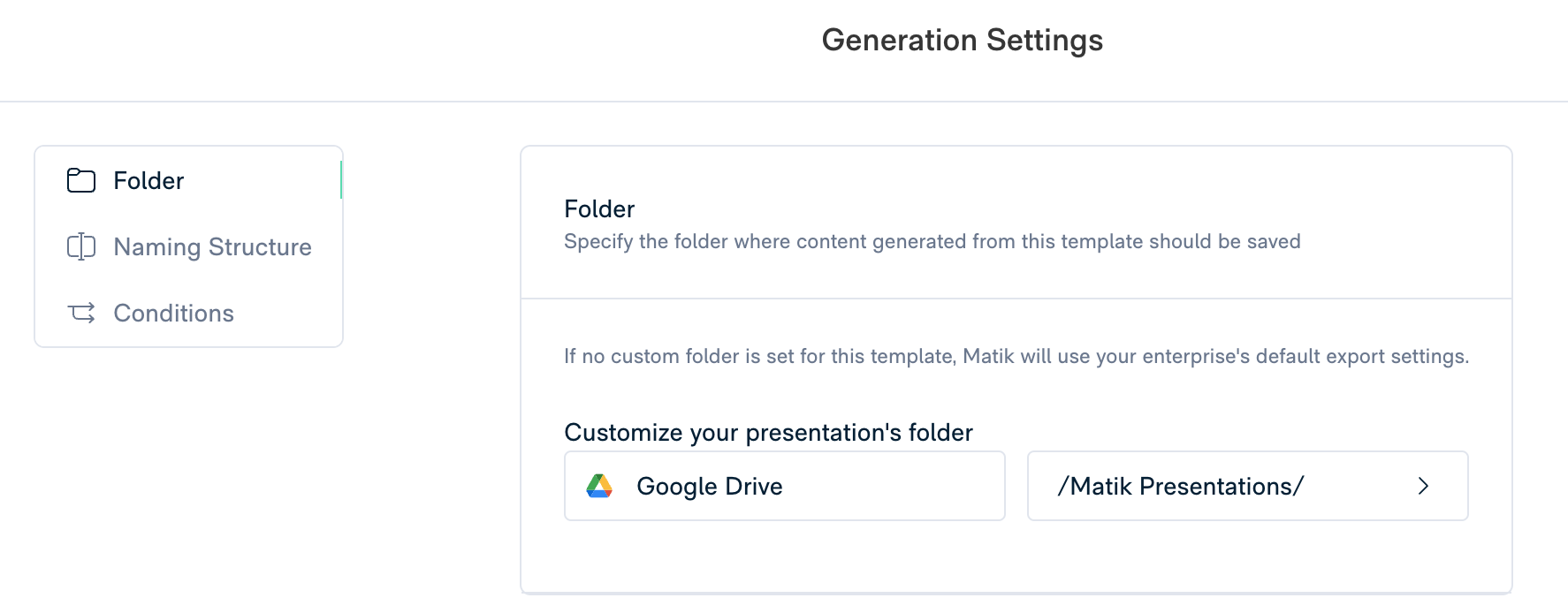 If no other folders are specified, generated presentations will be located in a Matik created folder on each users Google Drive of Office 365 account called "Matik Presentations". End users can override this by specifying a custom generation location before each generation.