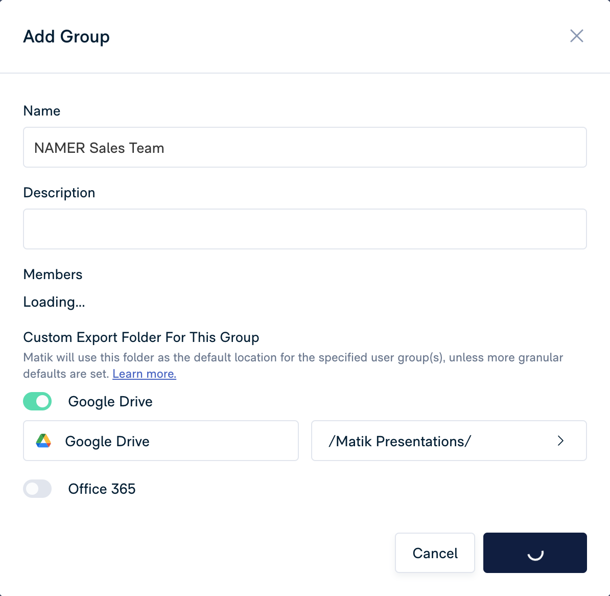 - Matik Presentations folder: If none of the above defaults are set, the presentation will be saved to the user’s "Matik Presentations" folder in Google Drive or Office 365.