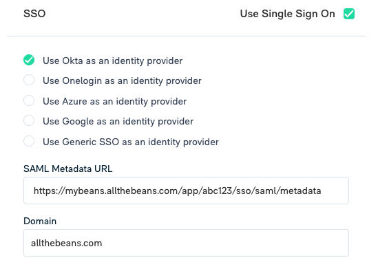 Select the "Use Single Sign On" in the right of the SSO section. Select the "Use Okta as an identify provider". Enter the SAML Metadata URL value you copied from Okta and your organization's domain. Click on Update in the bottom right corner to save.