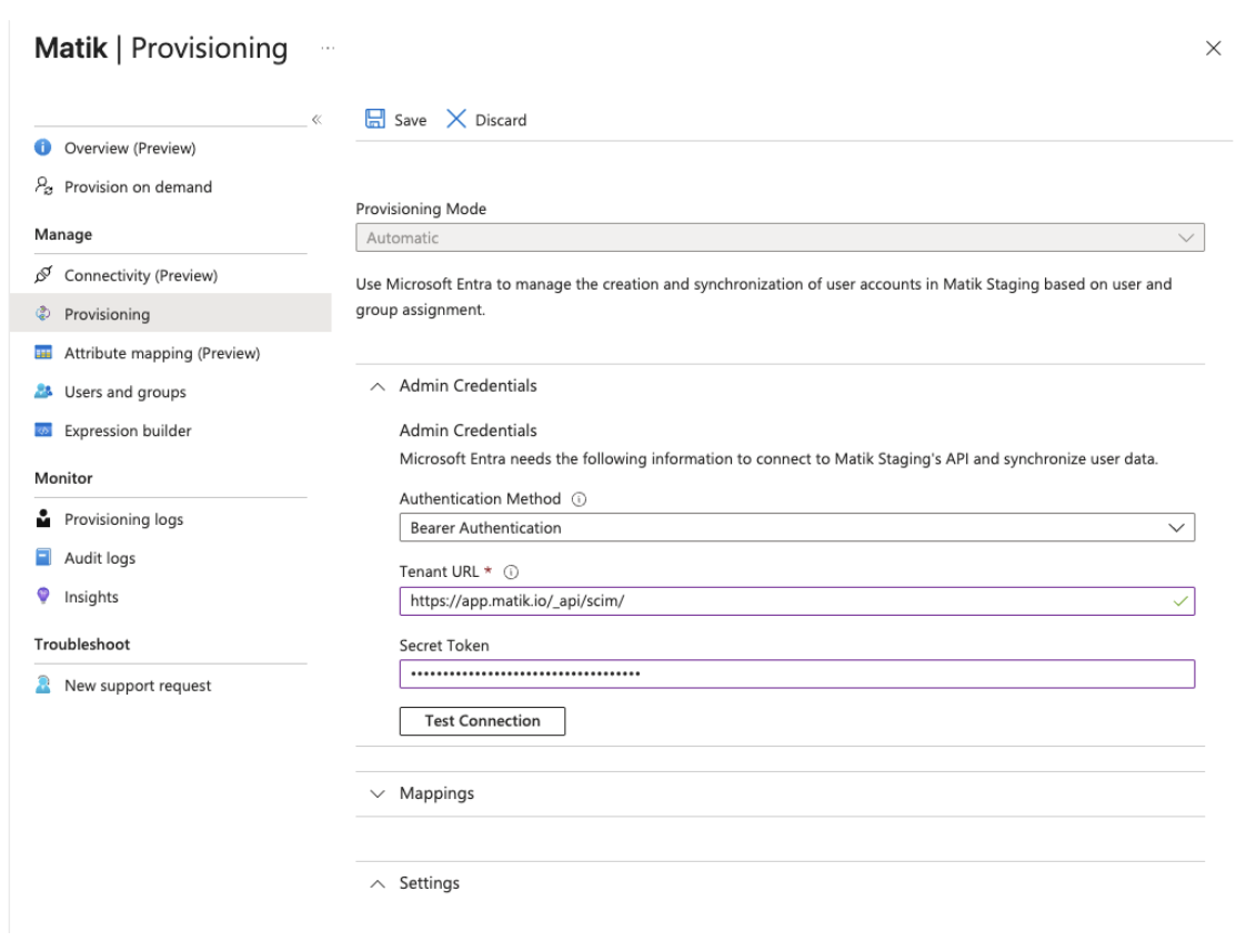 You can optionally configure SCIM-based user provisioning so that users assigned to the Matik application in Entra are automatically created in Matik. (If you do not want to configure provisioning, you can skip this section and instead add users to Matik manually before they sign in via SSO. See this article for more information on Adding Matik Users manually or through a CSV upload.)
