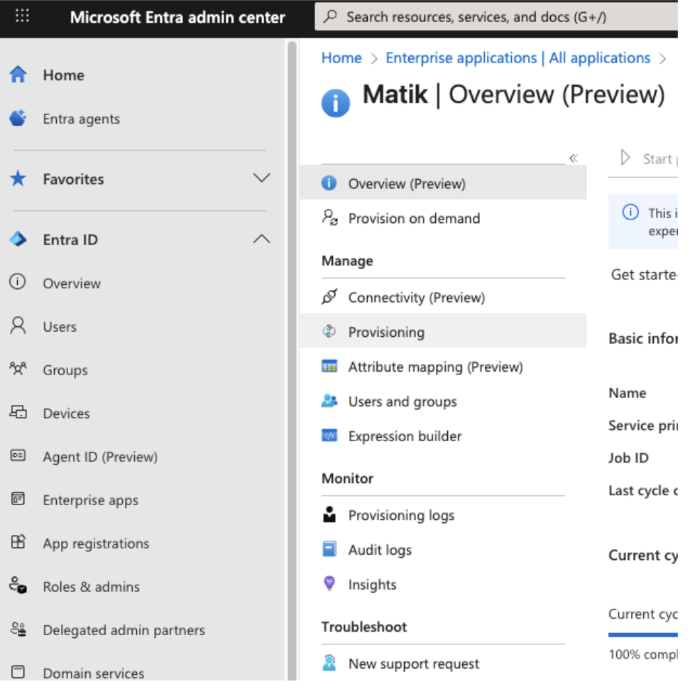 12. Go back to the application’s overview page in Microsoft Entra. On the menu, click Provisioning.